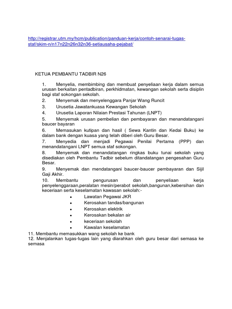L86z7z2xwrlhgm from demo.pdfslide.net Saya akan melaksanakan tugas tanpa diarah a. Dengan tugas yang diberikan, kepala desa diharapkan bisa membawa desa ke arah yang diharapkan oleh uu ini. E) memberikan khidmat sokongan dalam semua aktiviti yang dijalankan oleh jabatan. Senarai tugas pembantu setiausaha pejabat n19 setiausaha pejabat gred n29 5:12 pm credit photo keepcalm o matic. Encik wan muhamad nizamuddin bin wan ahmad. Bayaran elaun pembantu khas adalah secara proportionate mengikut bilangan hari bertugas secara sepenuh masa. Rm 1,352.00 rm 4,003.00 dengan kenaikkan tahunan rm100/tahun. Apakah deskripsi tugas pembantu perawatan kesihatan u11?