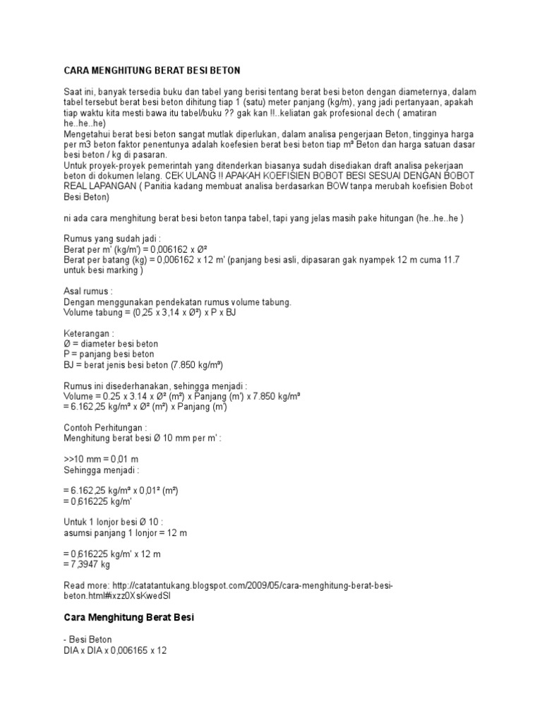 Penggunaan besi beton biasa disebut beton bertulang. Pada bagian tumpuan/tepi, bagian baca juga: Dihitung dengan sistem lembaran atau roll. Yang mempengaruhi harga cor beton. Besi= diameter 10mm dipasang jarak 20 cm berarti jumlahnya dalam 1m:0,2 m= 5bh, dipasang 2 lapis 2 arah berarti total jumlahnya 2 x 5 x triplek 8mm= ukuran triplek 1,2m x 2,4m maka luasnya 2,88m2.